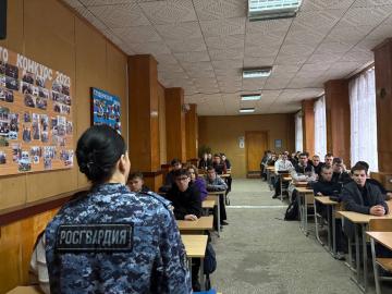 Перед обучающимися первого и второго курсов выступила психолог группы по работе с личным составом ОВО №1 филиала ФГКУ «УВО Войск национальной гвардии ЛНР» Вероника Витальевна Трофименко. В ходе встречи она рассказала о том, что отдел вневедомственной охраны проводит набор кандидатов для прохождения службы, а также подробно остановилась на структуре и задачах Росгвардии, особенностях службы, социальных гарантиях для сотрудников и возможностях профессионального и карьерного роста в ведомстве.